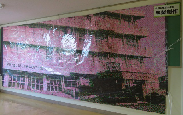 3年・卒業制作「モザイク画」・その1 公開日 2025/03/10 更新日 2025/03/10 3学年 3月10日(月) 7:30 3年生が卒業制作した「モザイク画」が掲示されました。(写真 上:生徒玄関掲示板…体育大会・団演技)(写真 下:体育館入り口前…校舎)少し下がって見てほしいです!