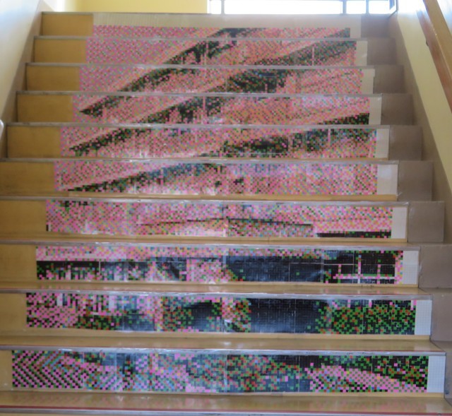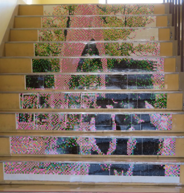 3年・卒業制作「モザイク画」・その2 公開日 2025/03/10 更新日 2025/03/10 3学年 3月9日(日) 7:30 卒業制作「モザイク画」は階段アートとしても掲示されています。(写真 上:B階段1~2階…校舎)(写真 下:B階段2~3階…修学旅行・広島・原爆の子の像)