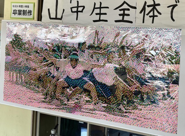 生徒玄関掲示板の体育大会・団演技の卒業制作「モザイク画」が光の関係で見えにくいので、リベンジ再撮影してきました。