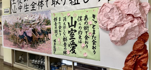 生徒玄関掲示板の3年・モザイク画の横に3年生からのメッセージが掲示されていました。