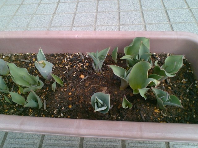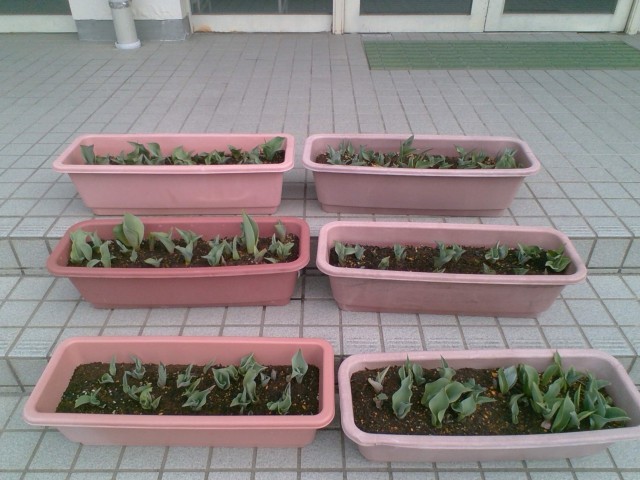 春風に吹かれ、生徒玄関前のチューリップが一斉に芽を出しています。