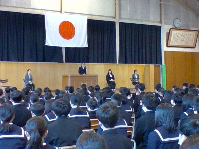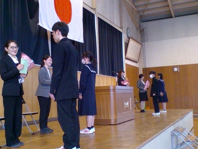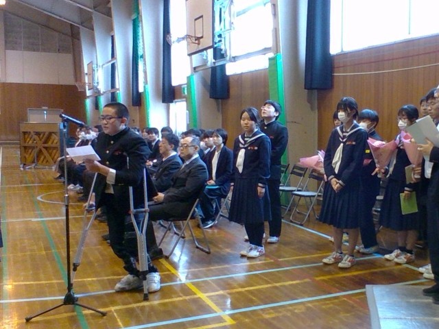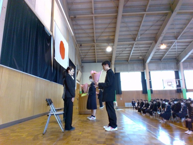 離任式 公開日 2025/03/24 更新日 2025/03/24 山室中学校のページ 3月24日(月) 「修了式」のあと、「離任式」を行いました。4名の教職員の方からお言葉をいただきました。生徒の代表がお礼の言葉を伝え、花束を贈呈しました。教職員の皆様、ありがとうございました。 +4