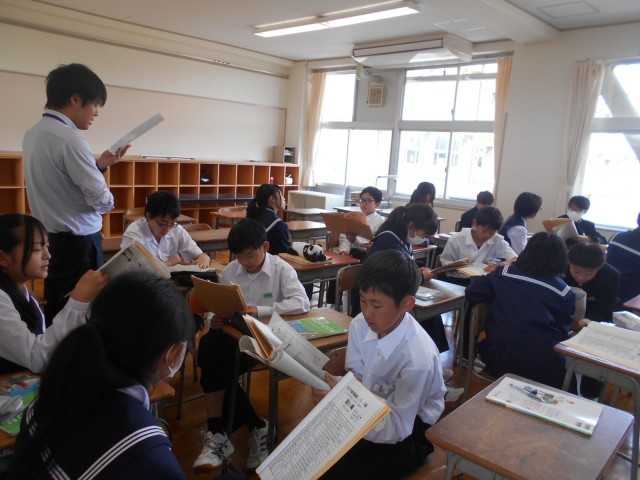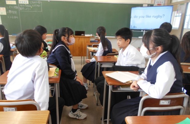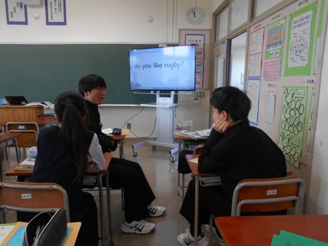 1年・英語・質問する文と否定する文 公開日 2025/05/07 更新日 2025/05/07 1学年 5月7日(水) 4限 1年生は、英語の授業を少人数で行っています。1年1組では、相手に「Do you like ~?」と質問する文を自分で考え、ペアワークで会話を楽しんでいました。