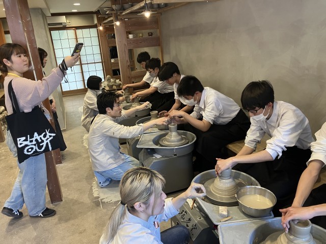 瑞光窯でろくろ体験をしています。職人さんが土から原形を作ってくださり、そこからカップの形を作っていきます。土の感触を楽しみながら、無口になって真剣に向き合っています。