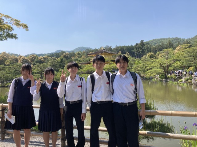 京都班別学習での金閣寺の様子です。気温が上がっている中、元気に生徒たちが庭園内を見学しています。