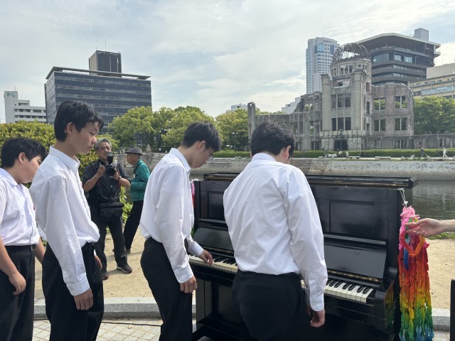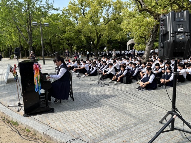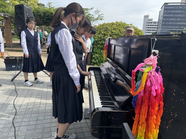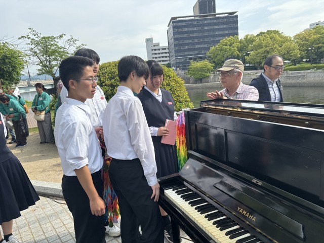 3年・修学旅行・平和セレモニーその2 公開日 2025/05/15 更新日 2025/05/15 3学年 5月15日(木)被爆ピアノの紹介を行ったあと代表の2名がピアノ演奏をしてくれました。その後、被爆ピアノの音を出してみたい生徒が鍵盤を触ってみたり、現地の方からピアノの説明を受けたりしていました。 +2