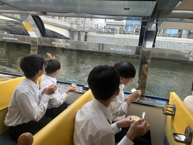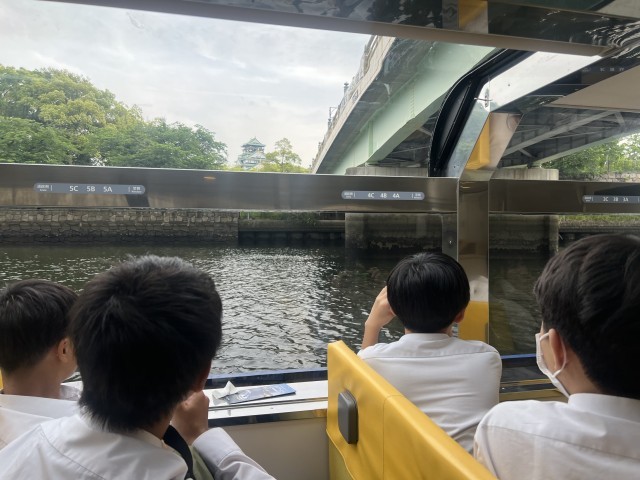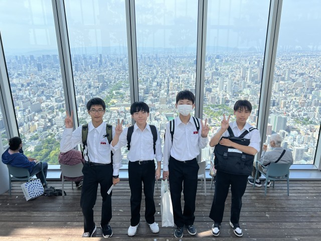 3年・修学旅行・あべのハルカス、観覧車チーム 公開日 2025/05/15 更新日 2025/05/15 3学年 晴れ渡った大阪の街を300mの高さを誇るあべのハルカスから一望しました。次に、淀川をアクアライナーで巡りました。大阪城を見れたり、川辺にいる人に手を振ってたり、アイスクリームを食べたり、思い思いに楽しんでいました。夕食とナイト観覧車に向かいます。