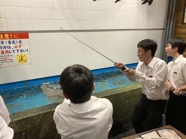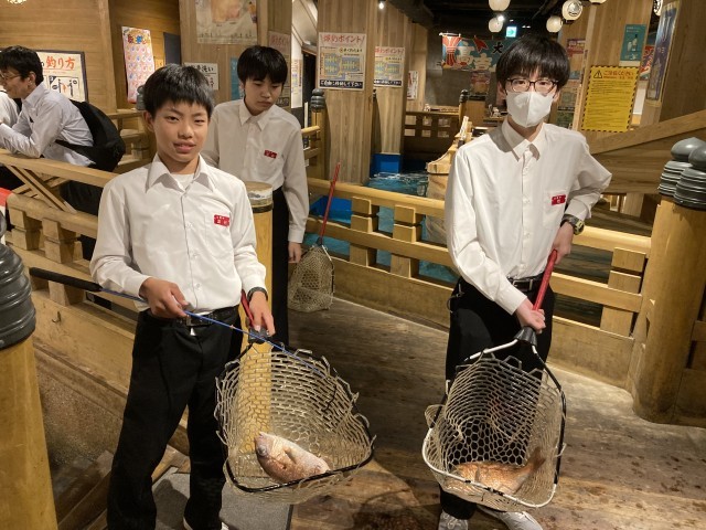 夕食の鯛釣り体験の様子です。釣り上げた鯛を嬉しそうに見せてくれてます。お店の前の通天閣で記念撮影です。