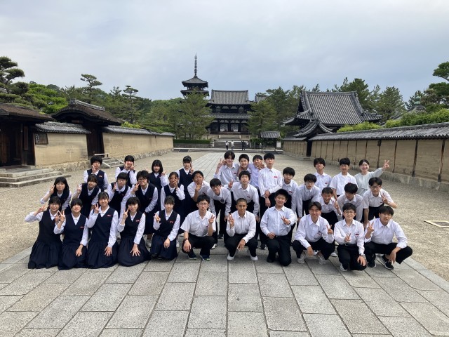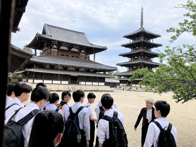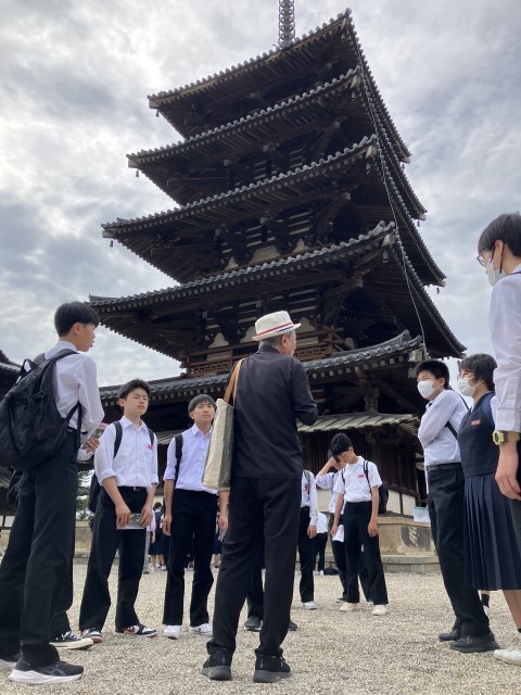 2組は法隆寺に来ています。2つのグループに分かれて、ガイドさんの解説を聞きながら見学しています。