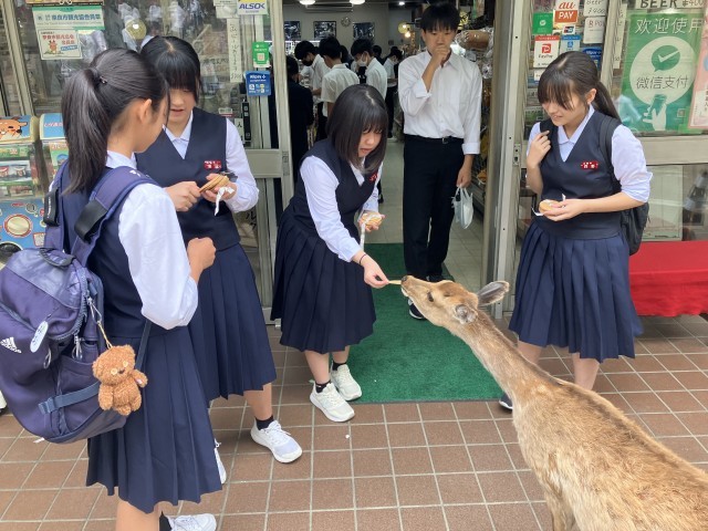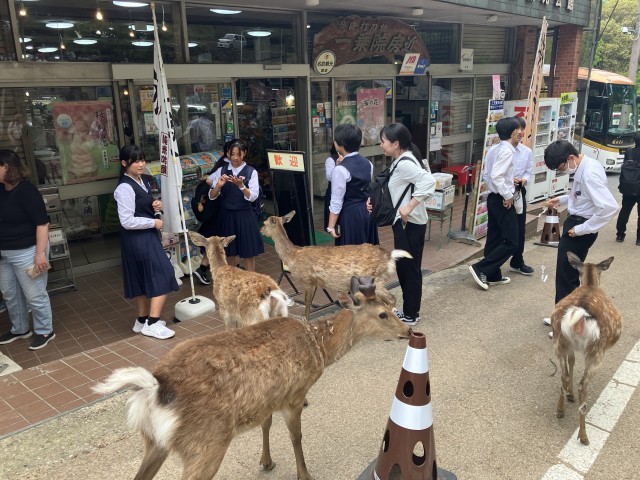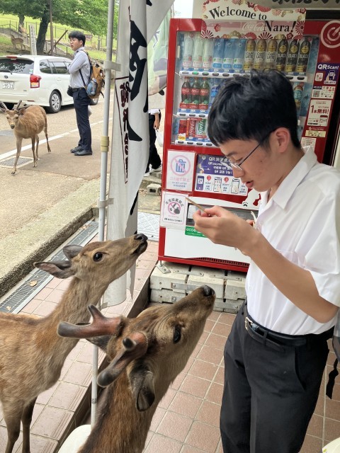 3年・修学旅行・2組奈良公園 公開日 2025/05/16 更新日 2025/05/16 3学年 お昼ご飯の後、鹿せんべいで鹿とたわむれました。鹿せんべいを手にするとどんどん近寄ってくる鹿たちの勢いに押されつつ、生徒たちは歓声を上げて楽しんでいました。