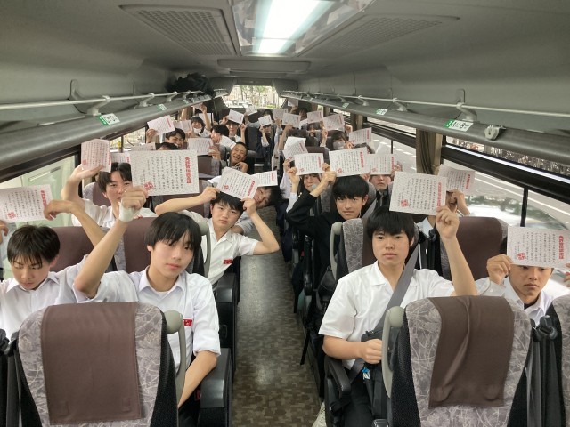 3年・修学旅行・3組車内&体験 公開日 2025/05/16 更新日 2025/05/16 3学年 3組はお好み焼き体験を行い、道場の認定証を受け取り、バス内で掲げています。南条サービスエリアから小矢部サービスエリアへ向かっています。