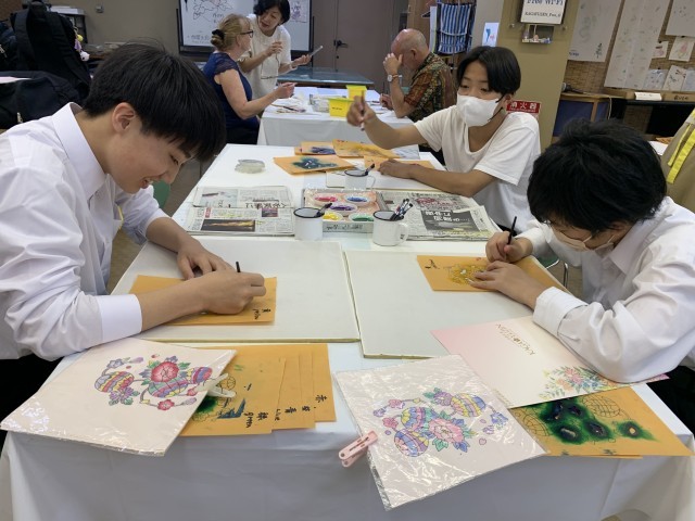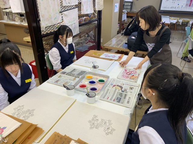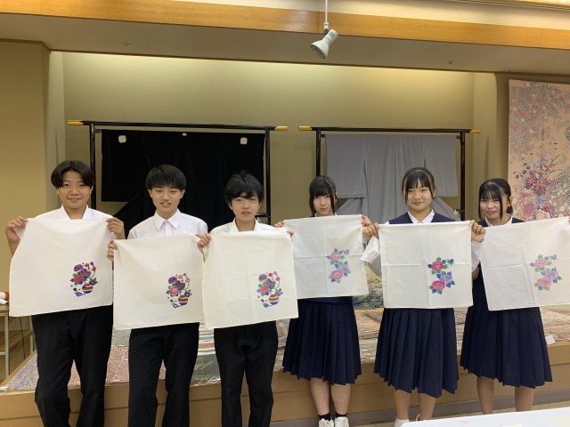 2年・金沢校外学習・加賀友禅体験 公開日 2025/05/20 更新日 2025/05/20 2学年 5月20日(火) 加賀友禅の染物体験をしました。濃淡をつけるのが難しく、苦戦していましたが、隣の外国人旅行客の方達と会話をしながら楽しく活動することができました。