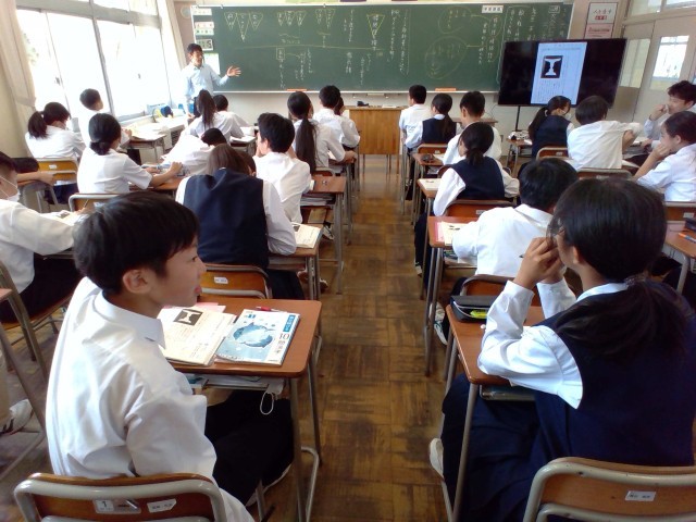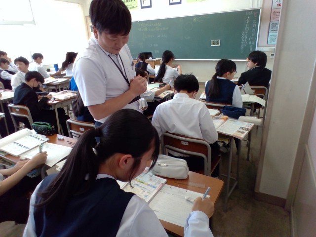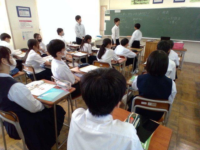 1年・授業風景 公開日 2025/06/04 更新日 2025/06/04 1学年 6月4日(水) 3限 1年生は、友達と話し合ったり、習ったことを自分なりにまとめたりと、意欲的に学習に励んでいます。3組では、ロールプレイをし、英会話を楽しんでいました。(写真 上:1年2組 社会「世界各地の人々の生活」)(写真 中:1年3組 英語(少人数)「友達の落とし物を拾ってあげよう」)(写真 下:1年5組 国語「ちょっと立ち止まって」)
