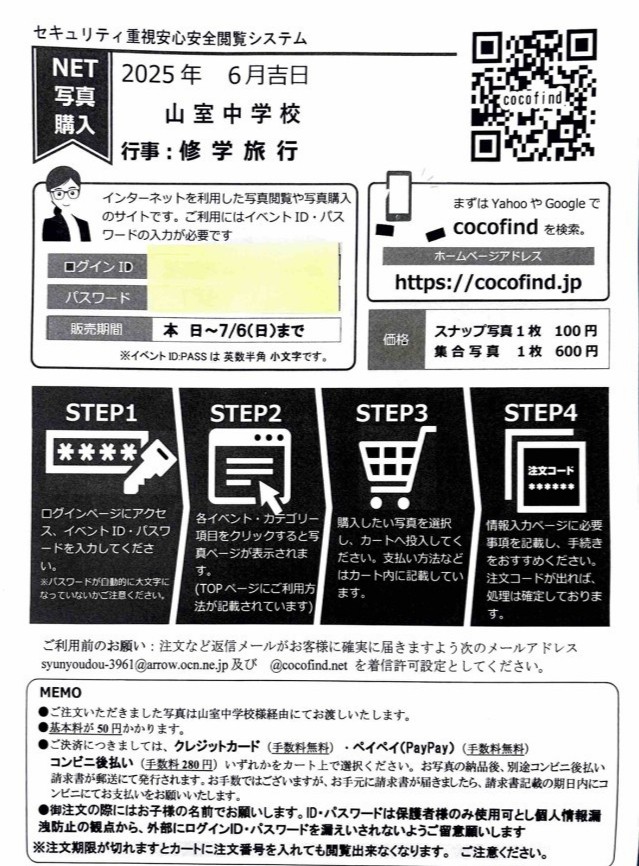 3年・修学旅行写真購入について 公開日 2025/06/12 更新日 2025/06/12 3学年 6月12日(木)本日、修学旅行の写真購入に関する書類を配布しました。販売期間は本日6月12日(木)から7月6日(日)です。