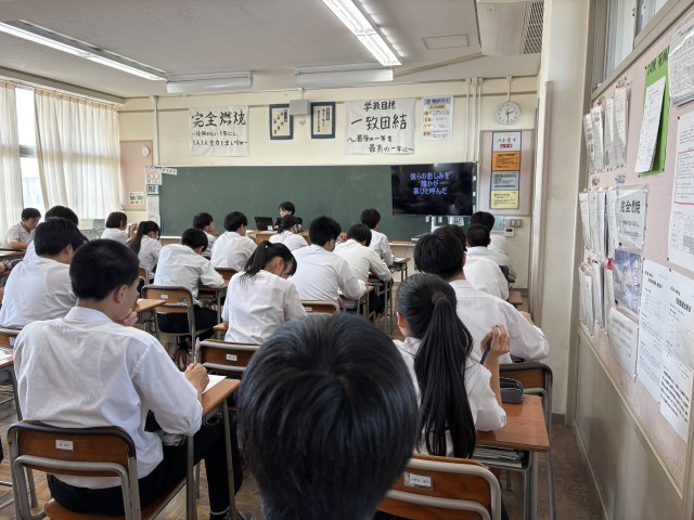 3年・総合・曲決め 公開日 2025/07/05 更新日 2025/07/05 3学年 7月4日(金) 6限 合唱コンクールのクラス曲決めを行いました。各クラスで、候補曲を聴きながらメモを取ったり歌詞を調べてみたりして選曲をしていました。(写真上から1組、2組、3組、4組、5組) +2