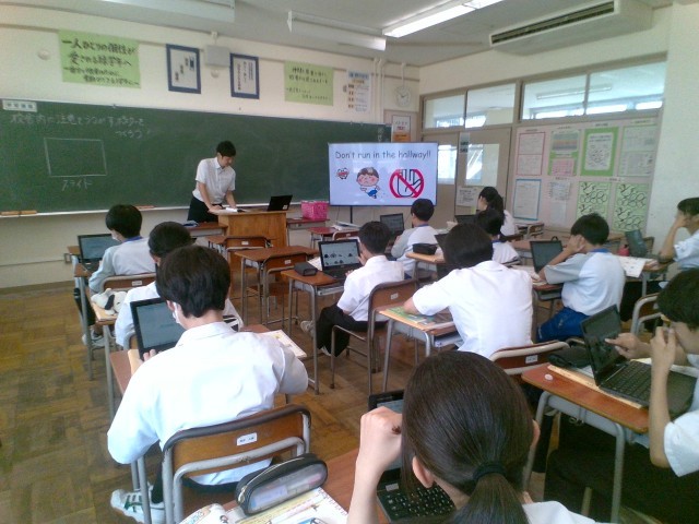 命令形を使って、校舎内で注意をうながすポスターを作っています。