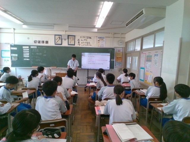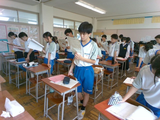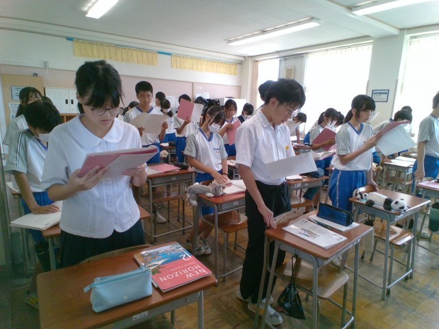 2年・英語・Unit3 公開日 2025/07/10 更新日 2025/07/10 2学年 7月10日(木) 6限 2年2組の英語の授業です。英文の音読練習をしています。・英語の発音をカタカナにしたものを読む・英語の音声をまねして読む・ヒントなしで、英文だけを見て何度も読む自分に合った読み方を選び、各自で練習をしています。英語音声の再生速度を変え、だんだん速く読めるように練習する場面もありました。
