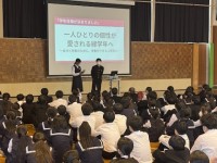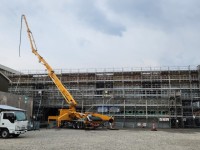 4月28日(月) 朝早くからコンクリートポンプ車が待機しています。体育館の屋根部...