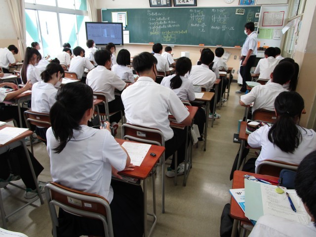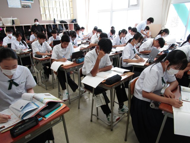 今日の3年生 その1 公開日 2025/09/11 更新日 2025/09/10 3学年 9月10日(水) 3限今日も3年生はひたすら真面目に集中して授業に取り組んでいます。 (写真 上:3年1組 体育) (写真 中:3年2組 英語) (写真 下:3年3組 数学)