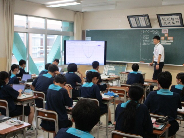 5組(数学)、2乗に比例する関数のグラフについて、その特徴を学習しています。