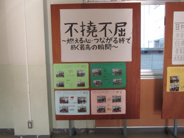 9月11日(木) 体育大会に向けて 公開日 2025/09/12 更新日 2025/09/11 3学年 生徒玄関には、今年の体育大会のテーマと日々の団リーダー練習の様子が掲示されています。掲示物は、実行委員が練習を巡回しながら作成してくれています。