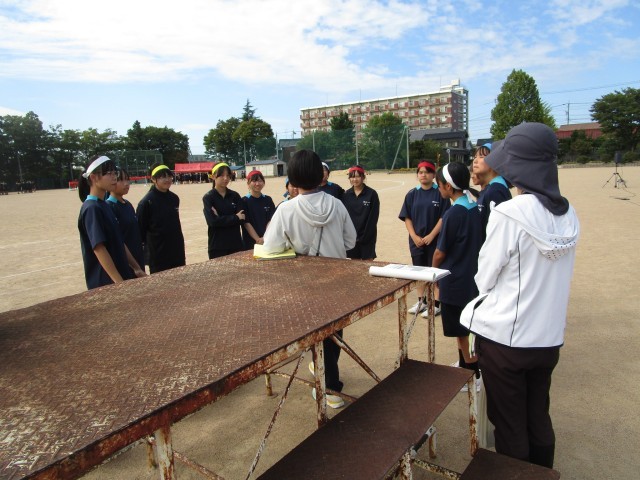 得点掲示係、決勝審判係、用具係の打ち合わせの様子です。