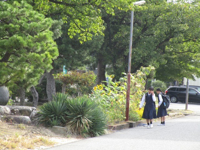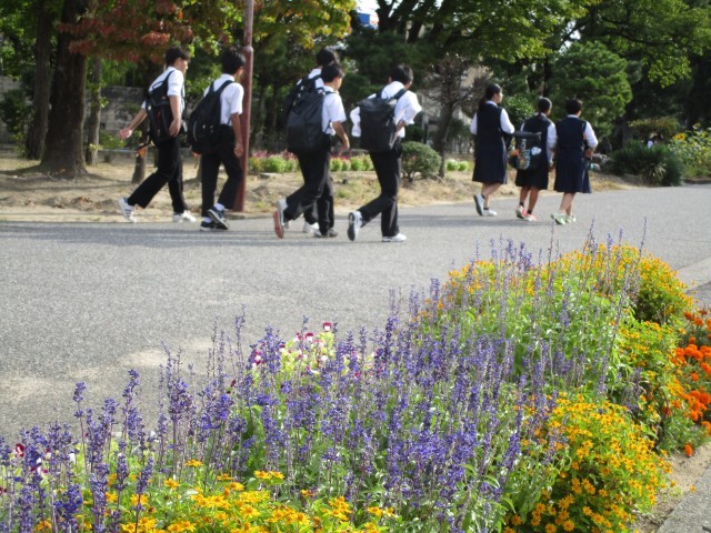 中間考査2日目の朝です。教科書を手に登校する3年生。花壇に水やりをしてから、教室に向かう1年生。今週最後の1日がスタートします。