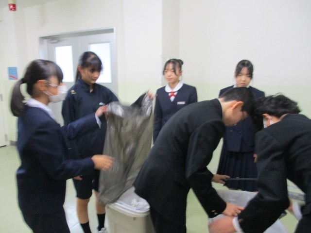 10月31日(金) 清掃の時間 公開日 2025/11/01 更新日 2025/10/31 生徒会 清掃の時間学校の各所のごみ箱のごみがA棟1階に運ばれます。待っていた環境委員が運ばれてきた「ごみ」を受け取って集約しています。