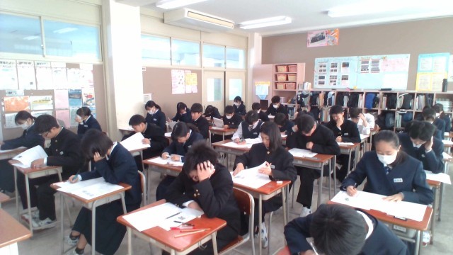 中教研学力調査2日目で、社会に取り組んでいました。写真は1年5組の様子です。