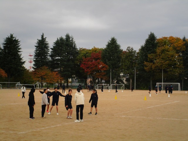 11月14日(木) 3年生 授業の様子(2限)② 公開日 2025/11/14 更新日 2025/11/14 3学年 4組(保険体育)は、サッカーをしていました。5組(数学)は、相似の条件に付いて学習していました。