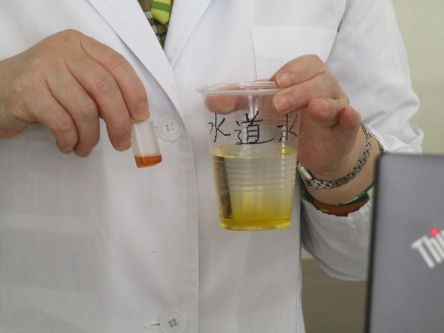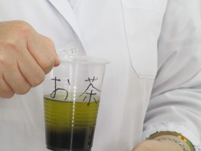 11月14日(金) 2学年薬物乱用防止教室 その3 公開日 2025/11/14 更新日 2025/11/14 2学年 薬剤師さんによる薬を飲む実験の様子。写真 上:薬を水で飲むと透明な色。 中:薬をお茶で飲むと・・ 下:実験の結果にびっくりした生徒たち!薬は水と一緒に飲みましょう!学校薬剤師と薬剤師のお二人に感謝申し上げます。
