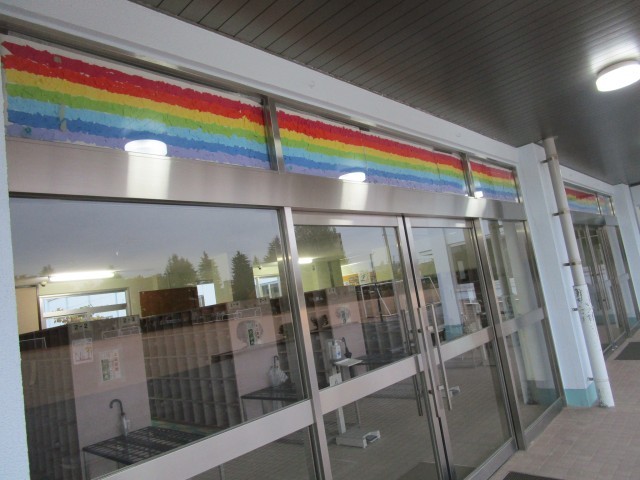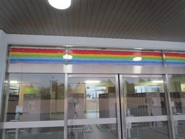 以前お知らせした生徒会執行部と有志の協力により後期生徒会のスローガン「虹」をアピールする工作が生徒玄関前に掲示されました。