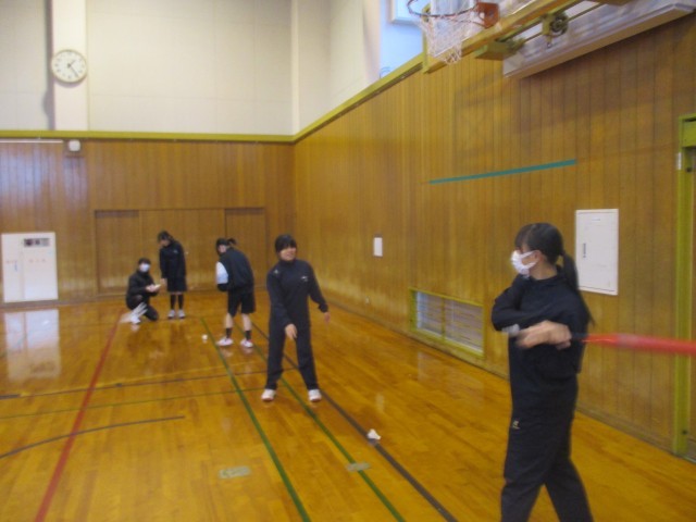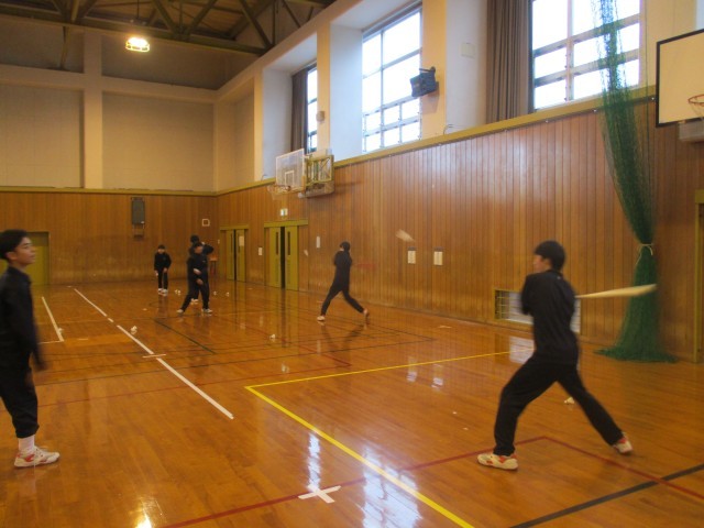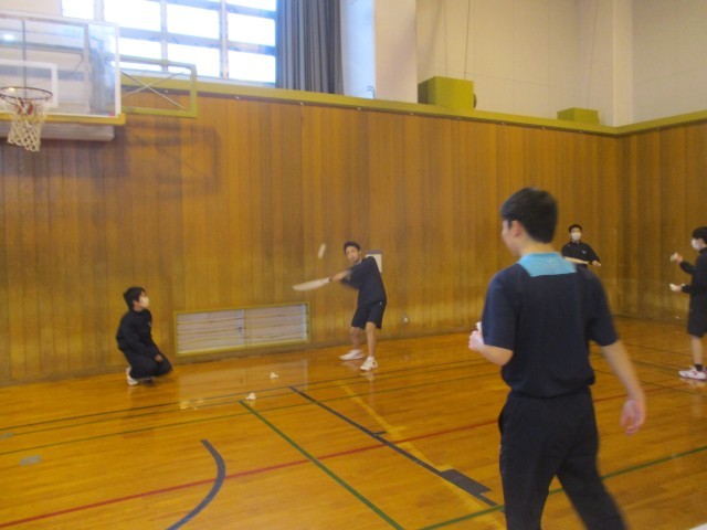 12月10日(水) 2年4組 保健体育の授業 公開日 2025/12/10 更新日 2025/12/10 2学年 5限 体育館にて。ソフトボールの授業ですが、ソフトボールの代わりにバドミントンのシャトルを打ち返しています。