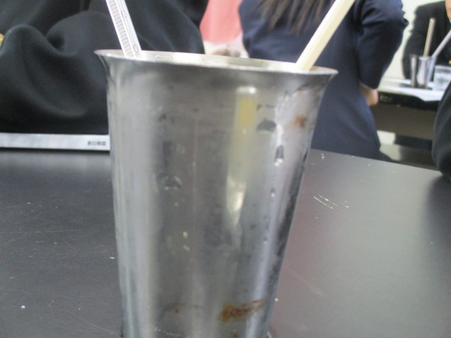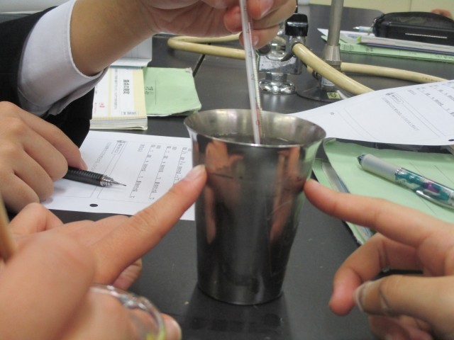 氷水を注いで露点の水温を測定する実験を行っています。(下:結露しました!)