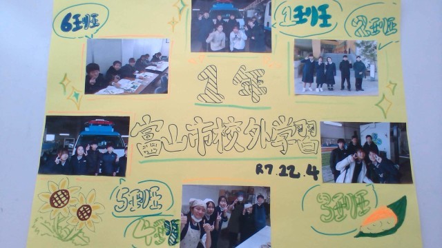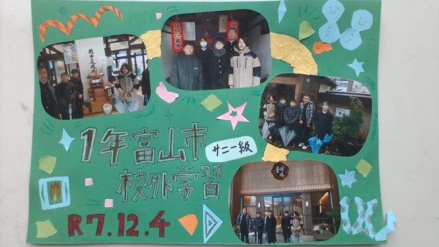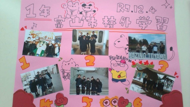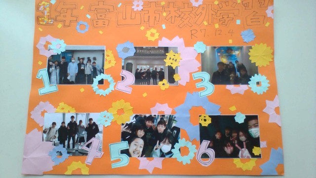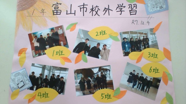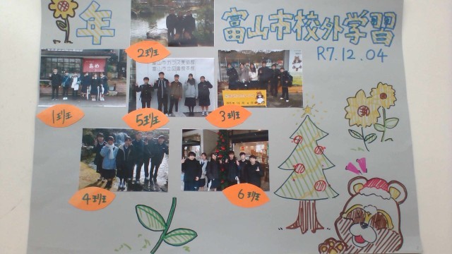 12月16日(火) 1年生 校外学習の掲示 公開日 2025/12/16 更新日 2025/12/16 1学年 12月4日に実施した校外学習の掲示をしました。12月17日からの懇談会に来校された際にぜひ近くでご覧ください。 +5