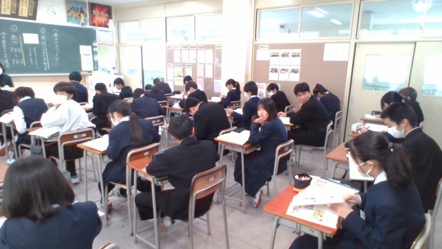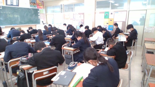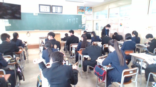 1組は国語、2組は社会、3組は国語で書初め練習をしていました。