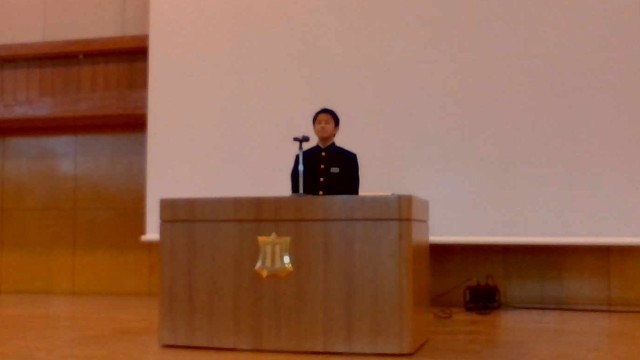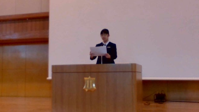 「まず授業をがんばりました。次に、行事をがんばりました。目立つ仕事だけでなく、裏方の仕事も努力しました。周囲の人の支えがあったからできたことも多いので周囲への感謝をしたい。これからも責任をもって様々なことを成し遂げたい。」という内容でした。