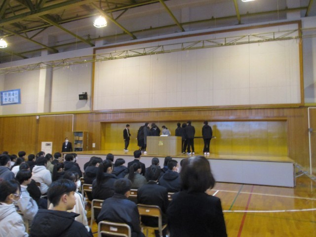 1月8日(木)2学年 3学年0学期 公開日 2026/01/08 更新日 2026/01/08 2学年 始業式後、2学年代表が意見発表を行いました。3学期は2年生にとって3年生になるために準備をする学期です。3年生0学期とも言われています。3年生になるための決意が語られました。また、1,2,3年生が体育館を退場する中、2年生の「式典係」が会場の片付けを行いました。2年生は、生徒会活動をはじめ、奥中の中心としての役割を果たしています。