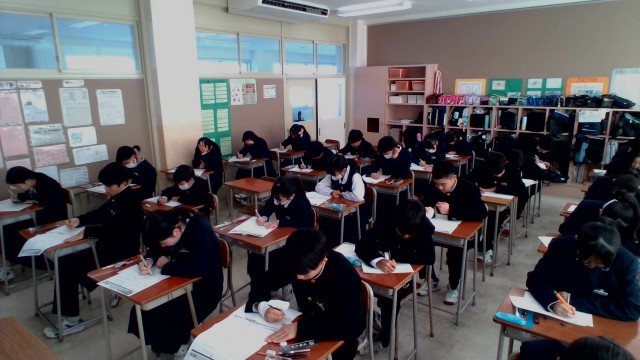 今日は朝から、社会、国語、理科、英語、数学の確認テストを行いました。