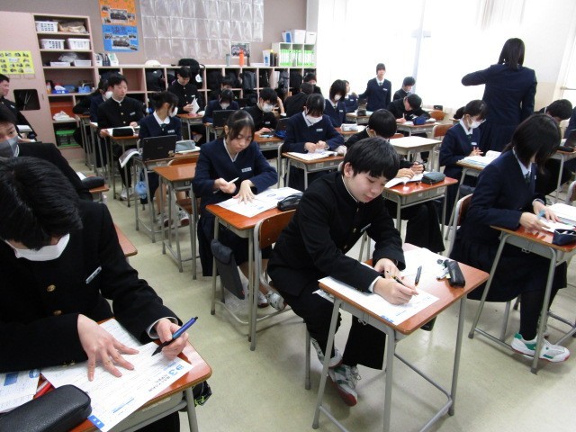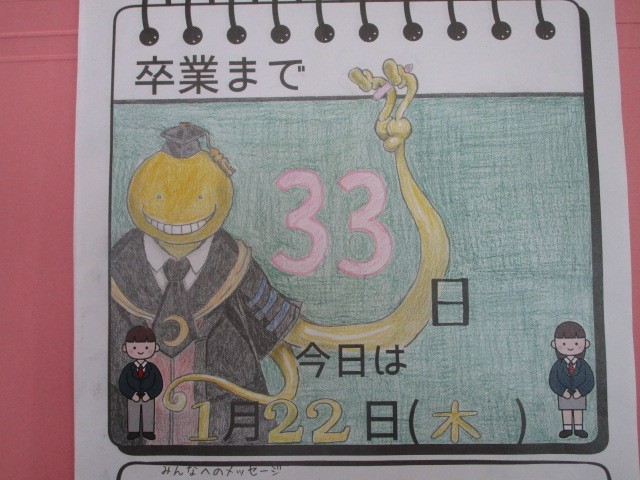 今日の3年生 その1 公開日 2026/01/22 更新日 2026/01/22 3学年 1月22日(木) 3限今日で卒業まで33日となりました。今日も3年生は授業にプリント学習に真剣に取り組んでいました。 (写真 上:カウントダウンカレンダー) (写真 中:3年1組 理科) (写真 下:3年2組 英語)