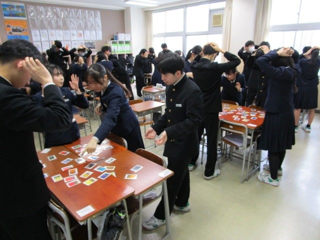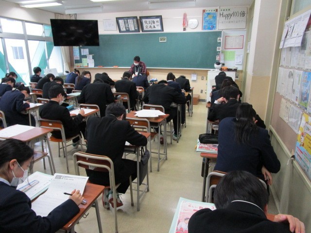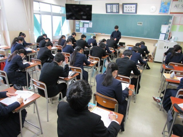3年生の授業の様子です。1組は美術「日本の伝統色」をモチーフにした、かるた大会をしました。2組は社会科3組は数学でした。学習プリントに取り組んで、3年生の学習を振り返っていました。