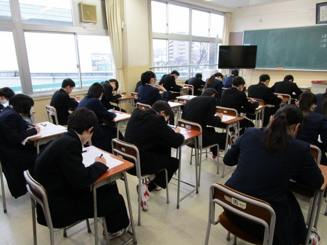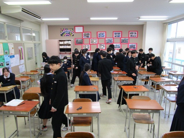 2月25日(水) 2学年 学年末考査 その1 公開日 2026/02/25 更新日 2026/02/25 2学年 8:302学年の「学年末考査」2日目、最初の実施教科は「英語科」です。最後までお互いに確認しています。(上の写真)リスニングを受けています(下の写真)