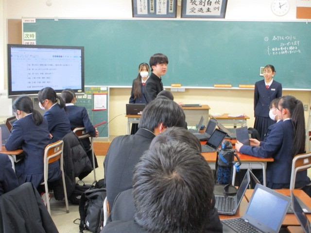 2月26日(木) 2学年 放課後の動き その1 公開日 2026/02/27 更新日 2026/02/27 2学年 放課後2学年の各学級の班長が集まりました。修学旅行に向け、各学級、学年全体に提案する「学年スローガン案」について事前アンケートに基づいた話合いが行われました。