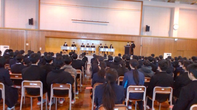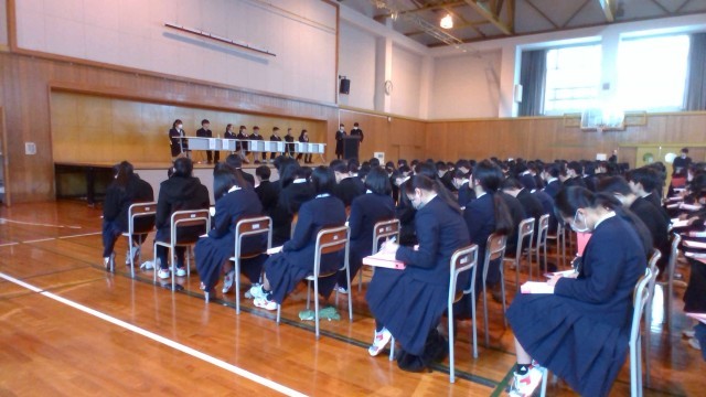 先輩に学ぶ講座 公開日 2026/03/06 更新日 2026/03/06 2学年 先輩に学ぶ講座として、現役の高校生から学校の特色や、受験勉強の方法等について話を聞きました。生徒はメモを取りながら真剣に話を聞いていました。