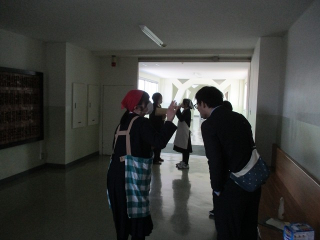 3年職員にあいさつする給食当番「今までありがとうございました!」(写真:上)