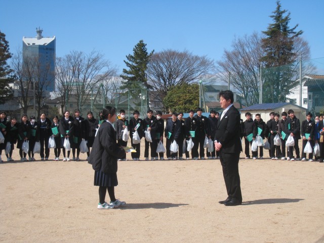 3月12日(木) 卒業証書授与式 その19 公開日 2026/03/12 更新日 2026/03/12 学校だより 卒業生 グラウンドへ集合!3年間、みんなを見守ってくださった学年主任の先生に思いを伝えました!