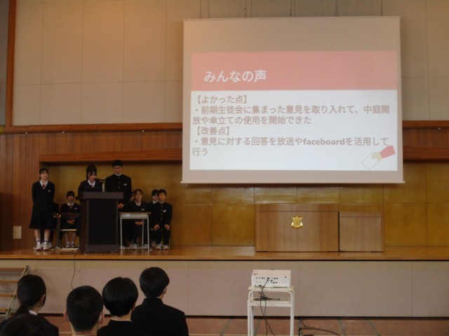 3月23日(月) 生徒会まとめ集会 公開日 2026/03/23 更新日 2026/03/23 生徒会 3限生徒会のまとめ集会が開かれました。執行部、各委員会が後期の活動の報告とふりかえりを行いました。