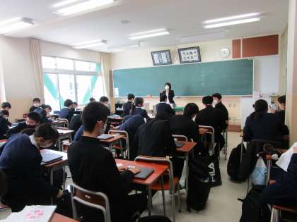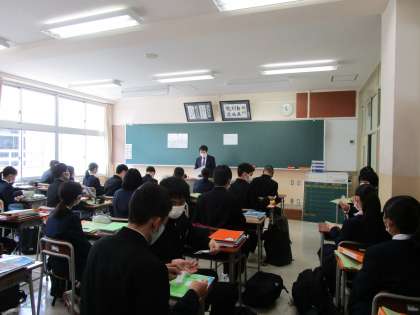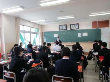 3年4組、5組、6組の初めての学活の様子です。先生からのいろいろな説明を生徒が聞いています。