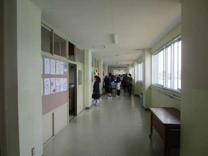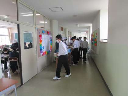 1年生が廊下で給食準備をしています。協力して準備しています。