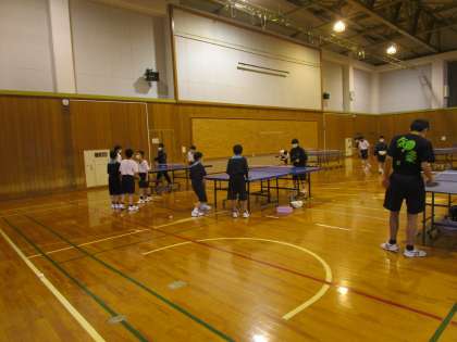 体育館の1年生の部活動体験です。男子卓球部と男子バスケットボール部が練習していました。